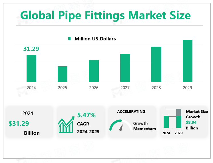 According to Global Market Monitor, the global pipe fittings market size is $31.29 billion in 2024 and is expected to grow to $40.23 billion by 2029.