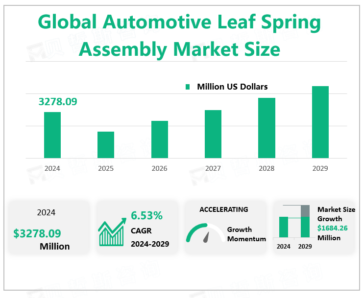 According to Global Market Monitor, the global automotive leaf spring assembly market size is $3278.09 million in 2024 and is expected to grow to $4962.35 million by 2029.