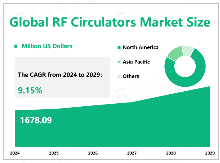 According to Global Market Monitor, the global RF circulators market size is $1678.09 million in 2024 with a CAGR of 9.15% from 2024 to 2029.