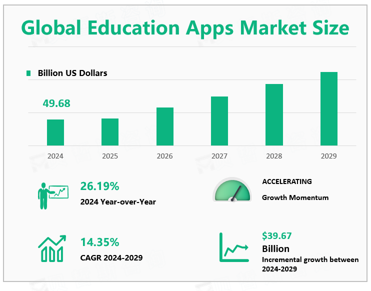 According to Global Market Monitor, the global education Apps market size is $49.68 billion in 2024 and is expected to grow to $89.35 billion by 2029.
