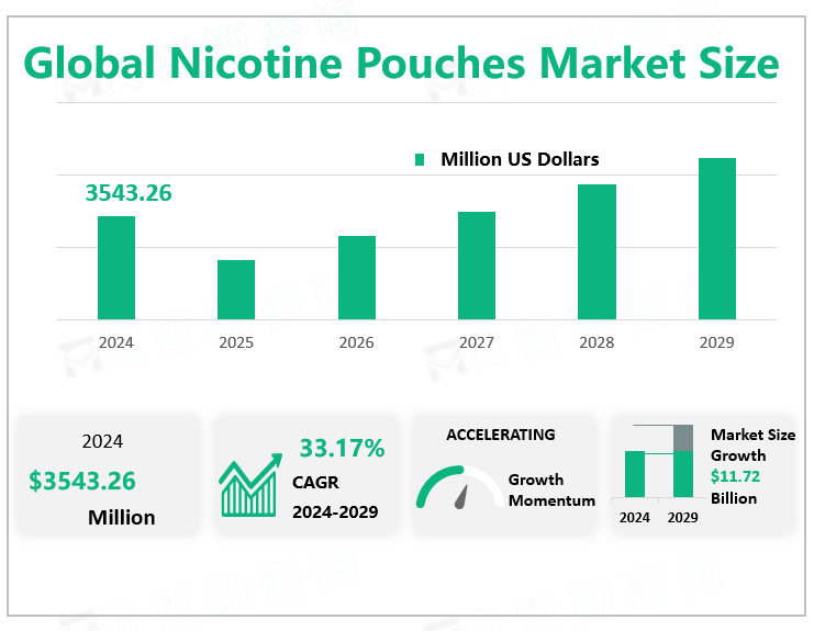 According to Global Market Monitor, the global nicotine pouches market size will be $3543.26 million in 2024 with a CAGR of 33.17% from 2024 to 2029.